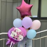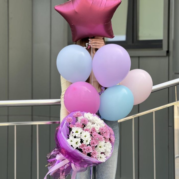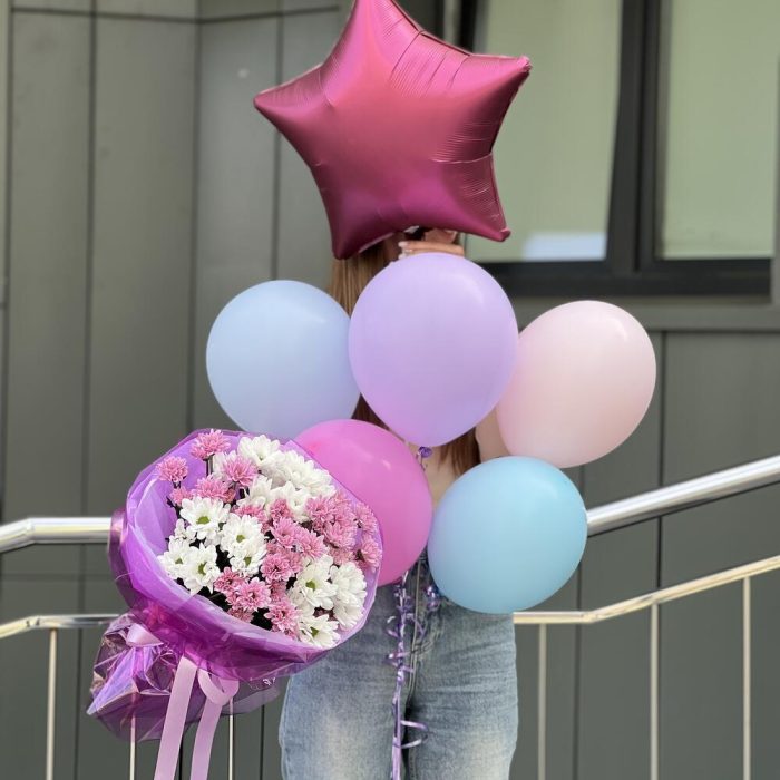 Хризантема – 7 шт. Оформление – 1 шт. сет шаров микс – 7 шт.