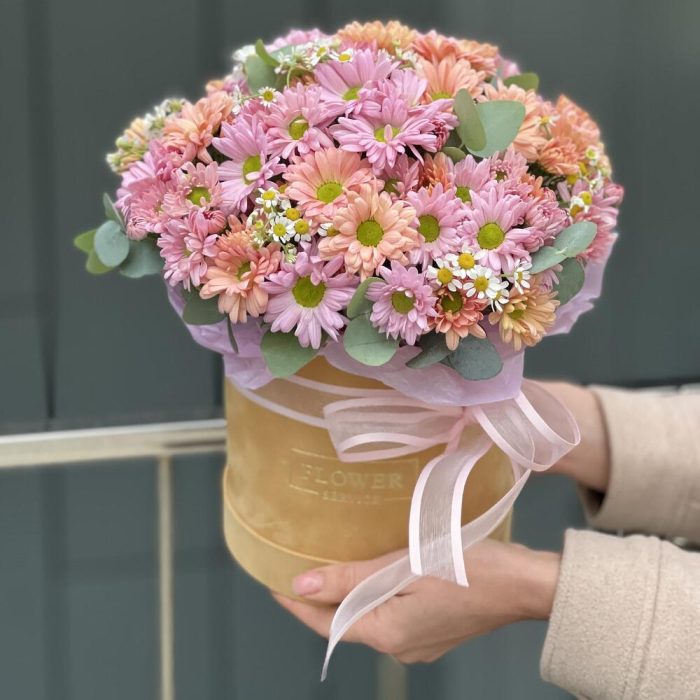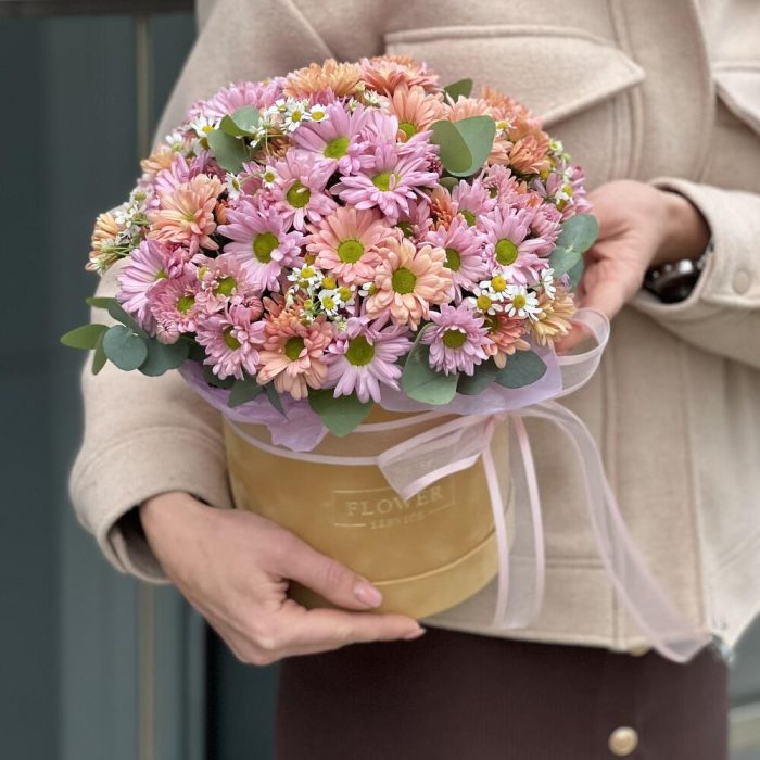 Коробка Теплый привет из хризантемы, танацетума и эвкалипта