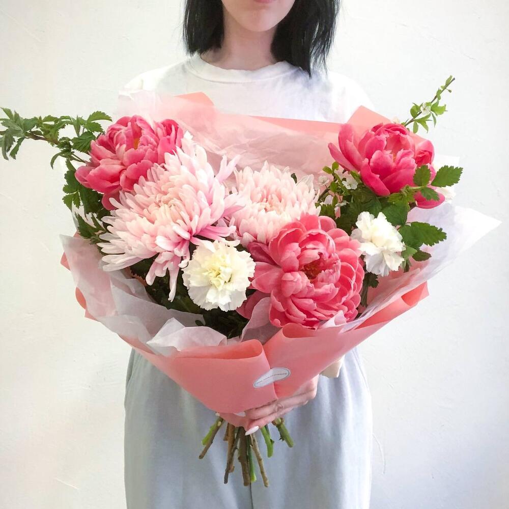Пион Коралл Шарм (Coral Charm) – 3 шт.Лента атласная – 1 шт.Тишью – 1 шт.Фисташка – 5 шт.Корейская пленка – 3 шт.хризантема антонов крашенный – 2 шт.ветки малины с листьями – 3 шт.даинтус – 4 шт.ветки яблони цветущие – 1 шт.авкапак – 1 шт.