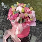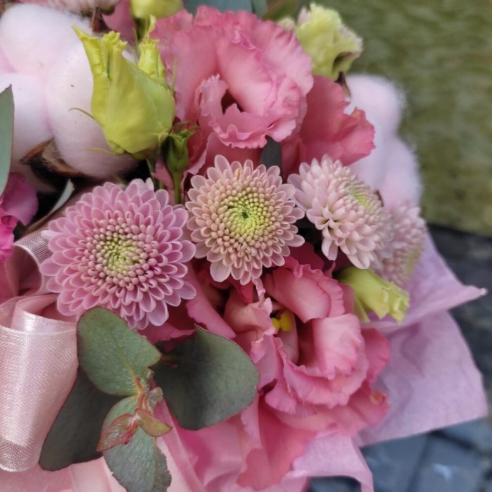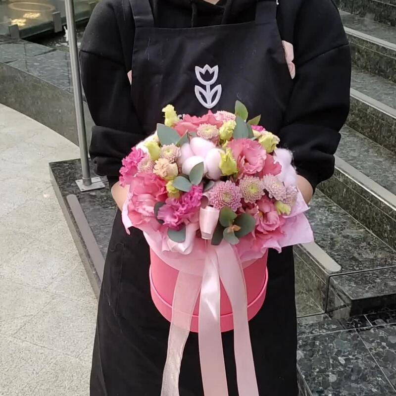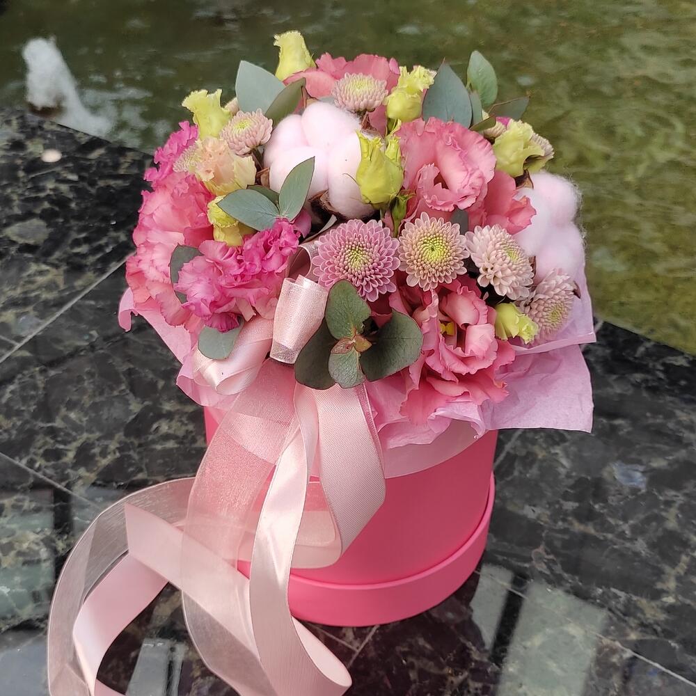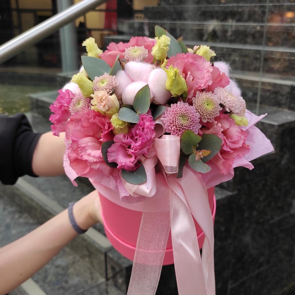 хлопок розовый – 3 шт.Эустома – 2 шт.Хризантема Сантини – 2 шт.Эвкалипт – 1 шт.Оазис – 1 шт.Коробка шляпная – 1 шт.
