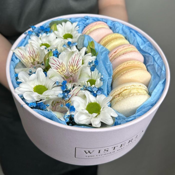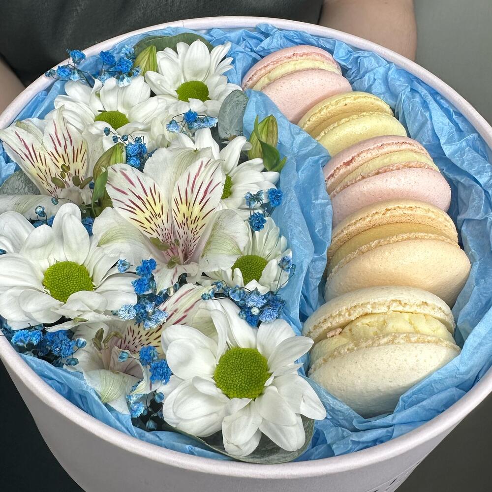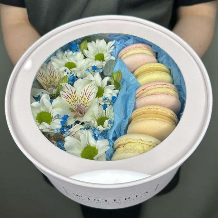 Альстромерия – 1 шт.Эвкалипт – 1 шт.Тишью – 1 шт.Хризантема кустовая ромашковая – 1 шт.Губка флористическая – 1 шт.гипсофила цветная – 1 шт.макарон ассорти – 5 шт.