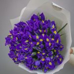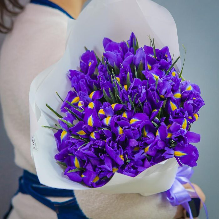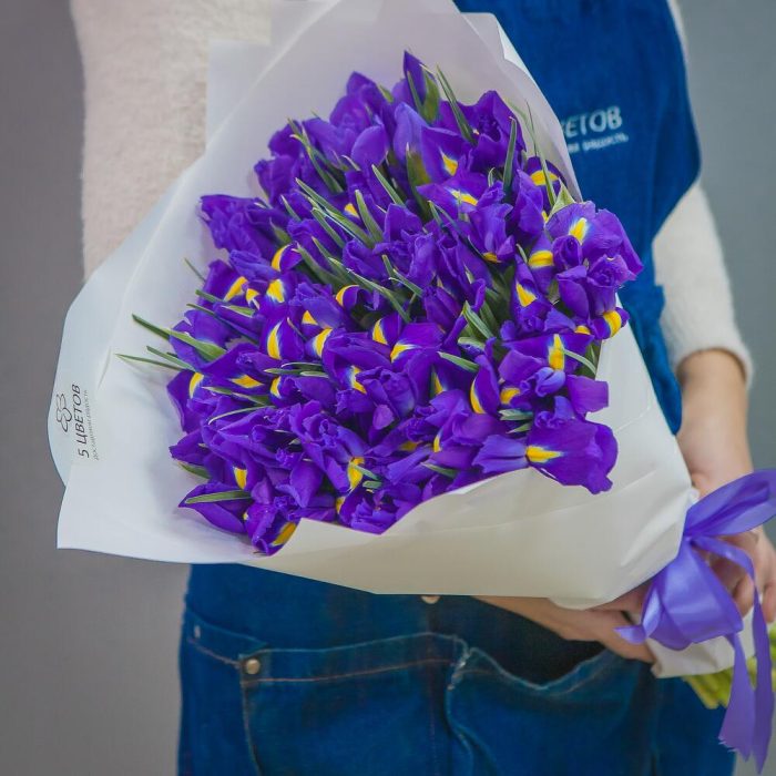 ирисы синие – 51 шт.Упаковка матовая – 1 шт.Лента атласная – 1 шт.