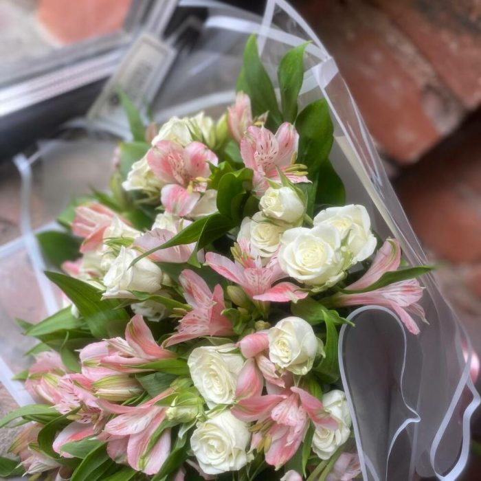 Альстромерия – 10 шт.Роза кустовая – 7 шт.Салал – 7 шт.Упаковка – 3 шт.