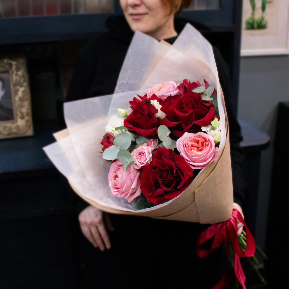 Французская роза – 3 шт.Пионовидная роза – 3 шт.Кустовая роза – 1 шт.Эустома – 1 шт.Альстромерия – 2 шт.Эвкалипт – 2 шт.Тишью – 2 шт.Крафт – 2 шт.Атласная лента – 2 шт.