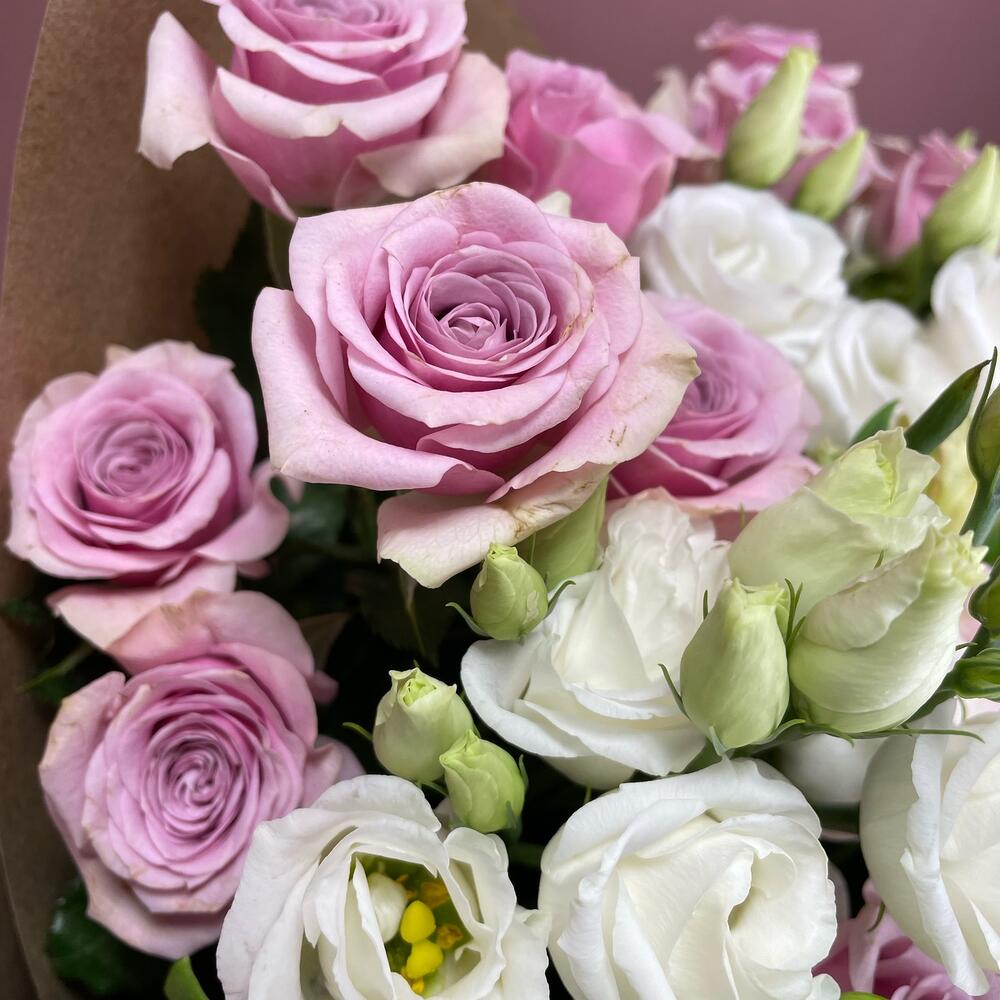 Роза кустовая – 9 шт.эустома белая – 5 шт.Альстромерия – 5 шт.Крафт упаковка – 5 шт.