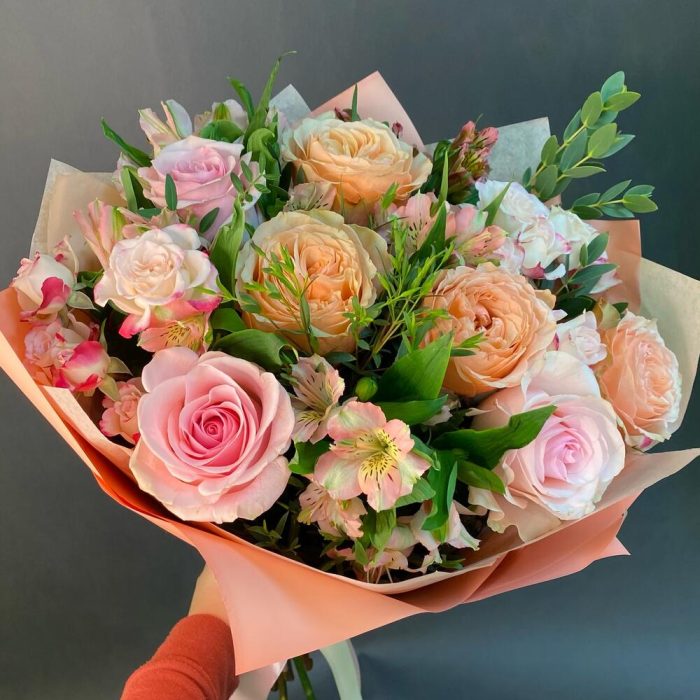 Роза Эквадор – 7 шт.Роза кустовая – 2 шт.Альстромерия Микс Европа – 5 шт.зелень декоративная – 5 шт.Упаковка дизайнерская – 5 шт.Лента атласная – 1 шт.