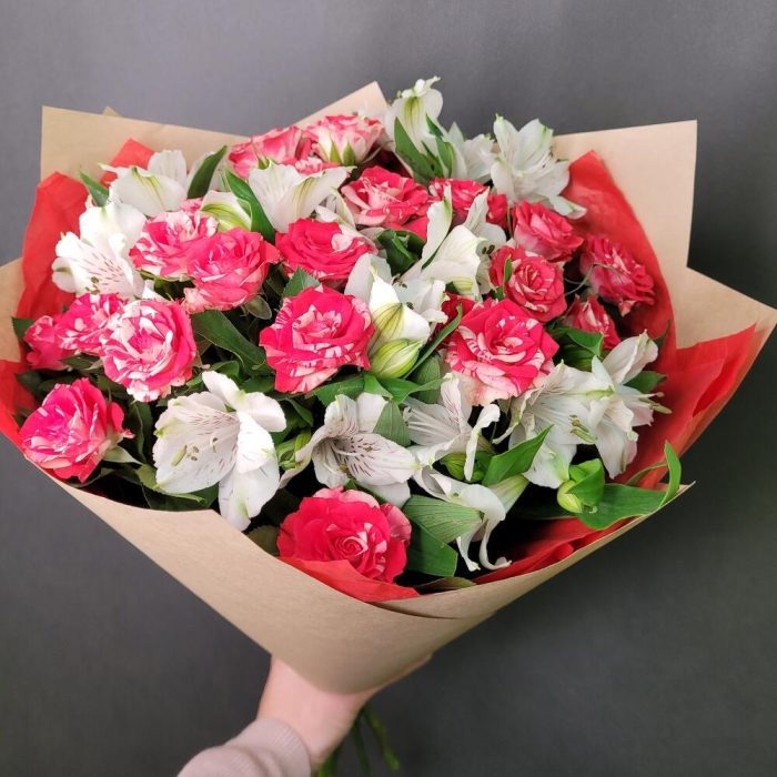 Роза кустовая – 3 шт.Альстромерия – 5 шт.Тишью – 2 шт.Крафт – 2 шт.