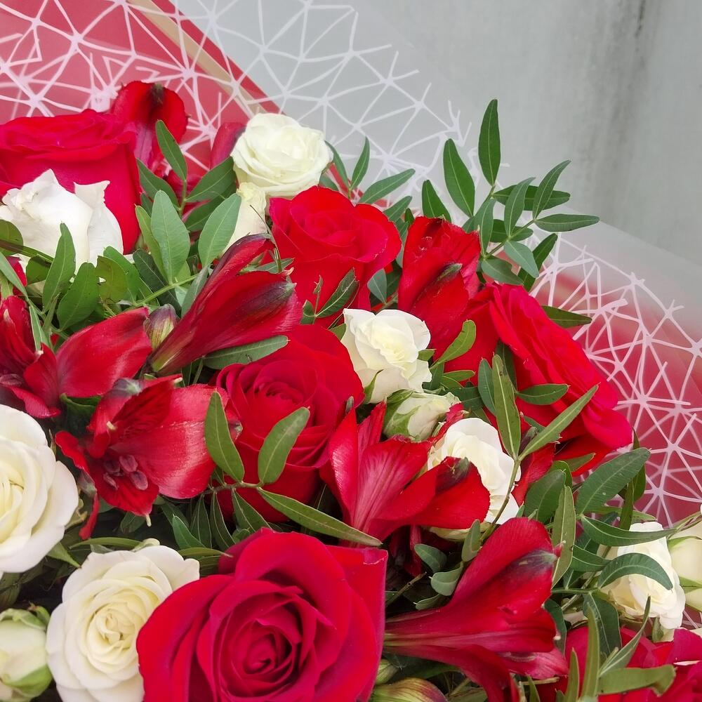 Роза Эксплорер – 11 шт.Роза кустовая белая – 7 шт.Альстромерия красная – 7 шт.фисташка зелень – 15 шт.Упаковка дизайнерская – 3 шт.