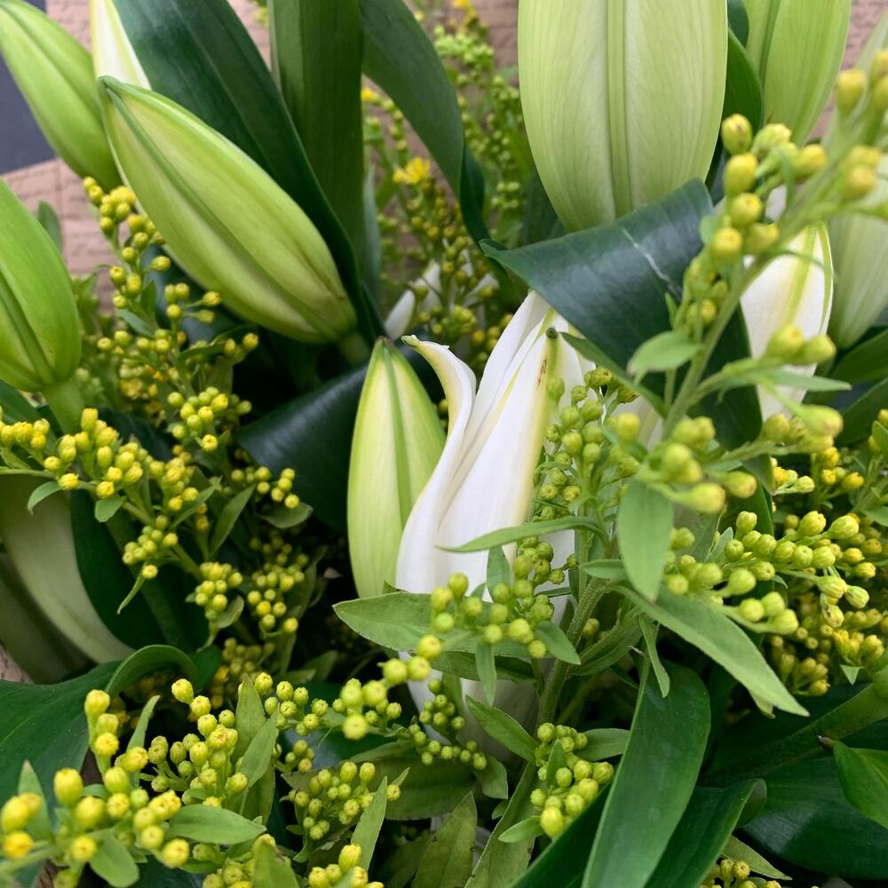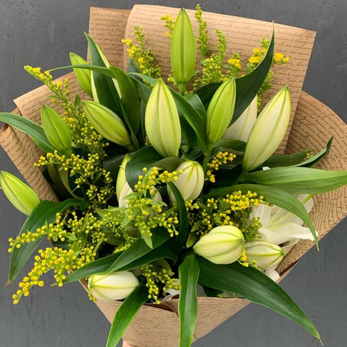 Букет из 5 белых лилий и солидаго в крафте
