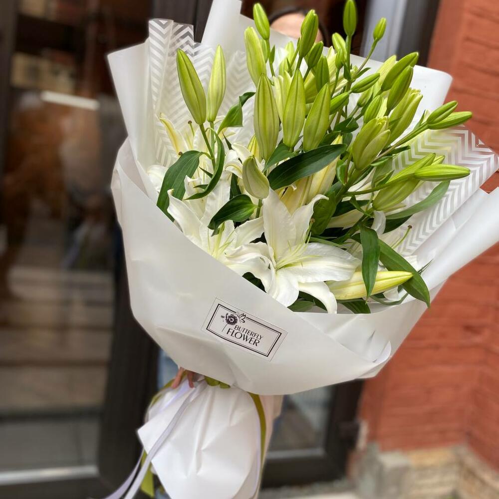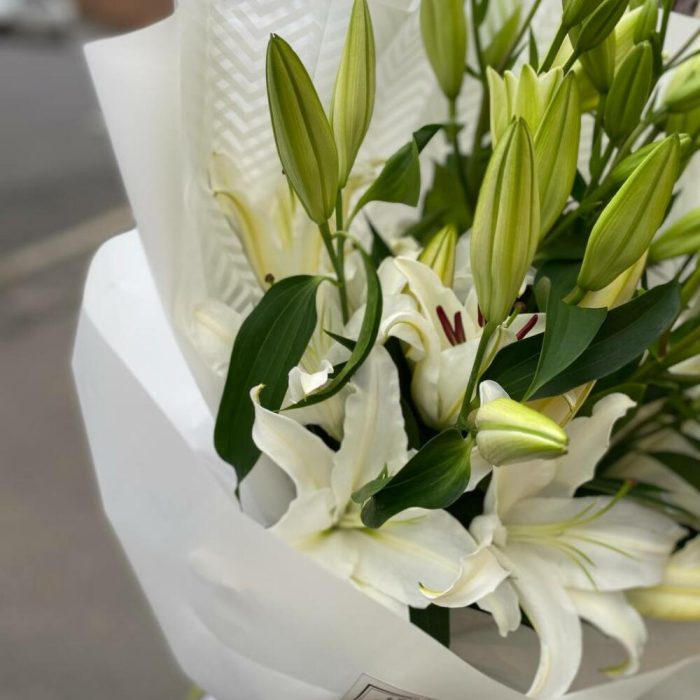 Букет из 9 белых лилий в дизайнерской упаковке “Ливерпуль”