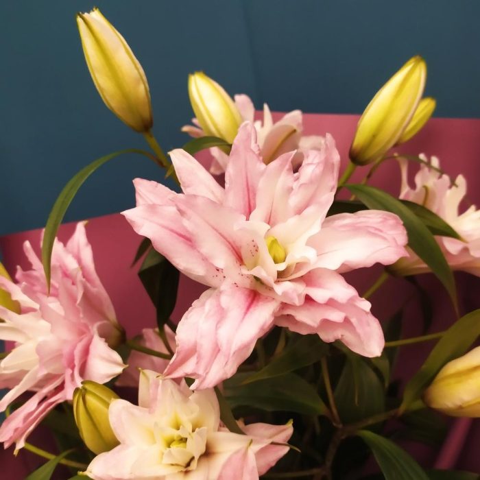 Лента атласная – 1 шт.Упаковка дизайнерская – 4 шт.лилия пионовидная махровая белая – 5 шт.
