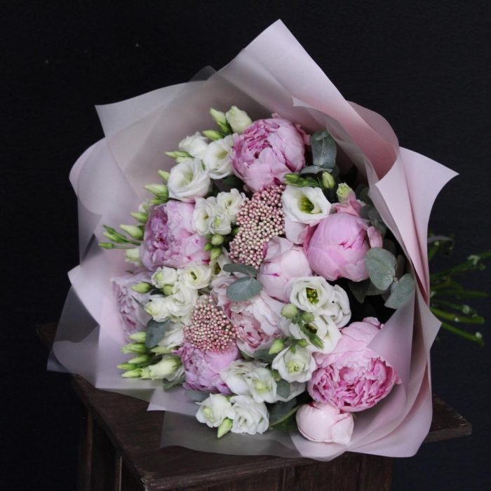 Озотамнус – 2 шт.Эвкалипт – 3 шт.Эустома – 5 шт.Лента атласная – 2 шт.Пион Сара Бернар – 9 шт.Пленка дизайнерская – 5 шт.