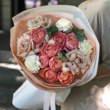 Пион – 5 шт. Твидия – 3 шт. Эвкалипт – 1 шт. Лизиантус – 2 шт.