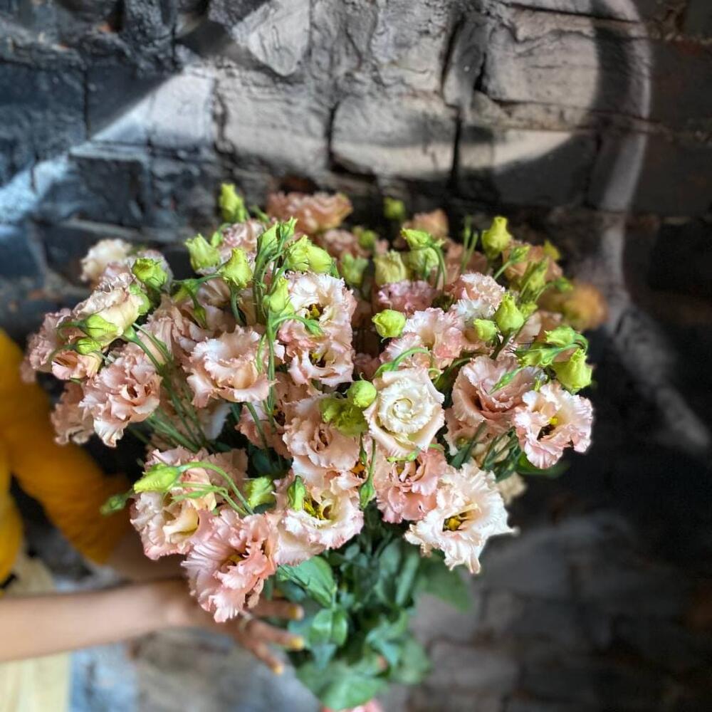 Букет из 15 персиковых эустом (лизиантусов) в стильной упаковке “Дитрих”