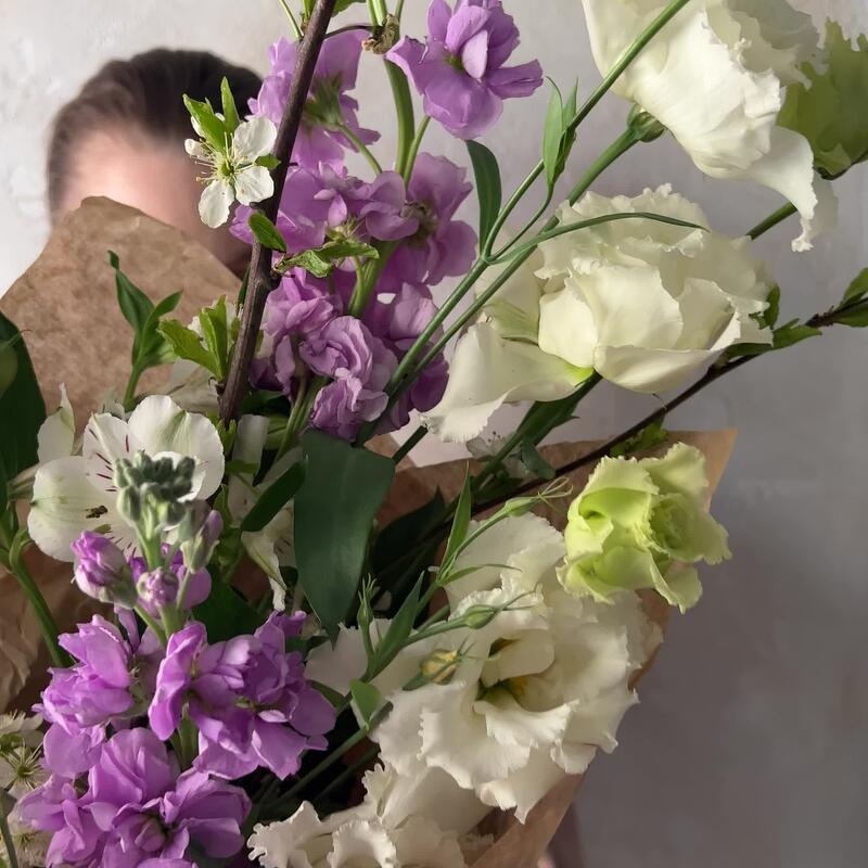 Альстромерия – 2 шт.Лизиантус – 2 шт.Маттиола – 4 шт.Сирень – 1 шт.Роза – 3 шт.Авторская упаковка – 1 шт.ветки черешни – 1 шт.
