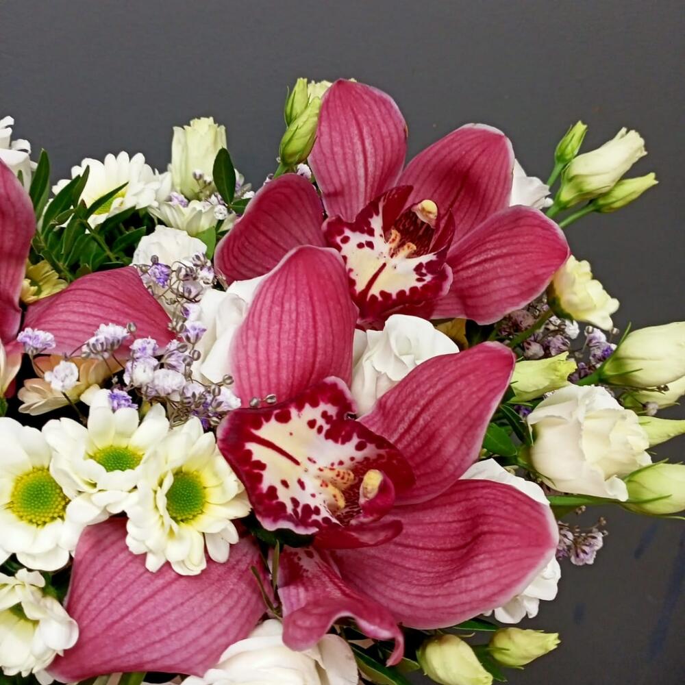 Гипсофила – 1 шт.Орхидея Цимбидиум – 3 шт.Эустома – 2 шт.Кашпо – 1 шт.Сантини – 2 шт.Оазис флористический – 1 шт.зелень декоративная – 2 шт.