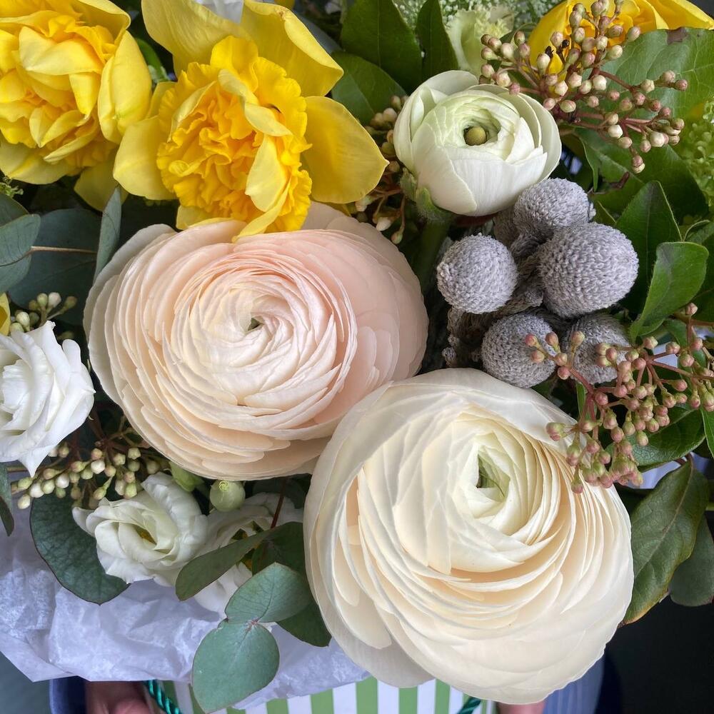 Композиция в шляпной коробке с ранункулюсами и нарциссами