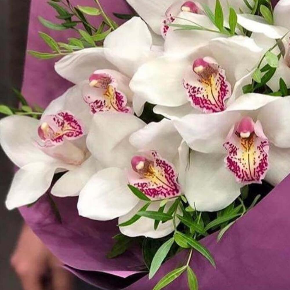 Орхидея Цимбидиум – 7 шт.Зелень – 5 шт.Лента атласная – 2 шт.Упаковка дизайнерская – 2 шт.