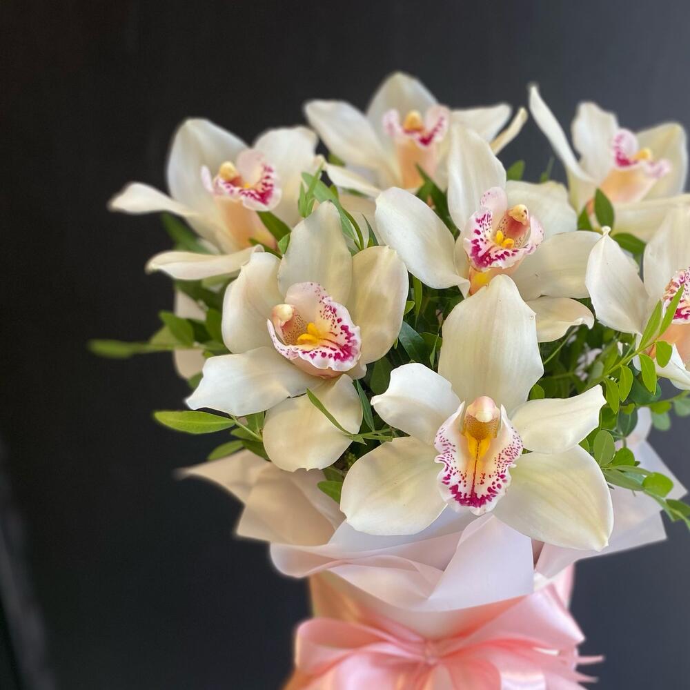 Зелень – 8 шт.Упаковка – 3 шт.Лента атласная – 5 шт.Коробка шляпная – 1 шт.орхидея цимбидиум розоваябелая – 7 шт.