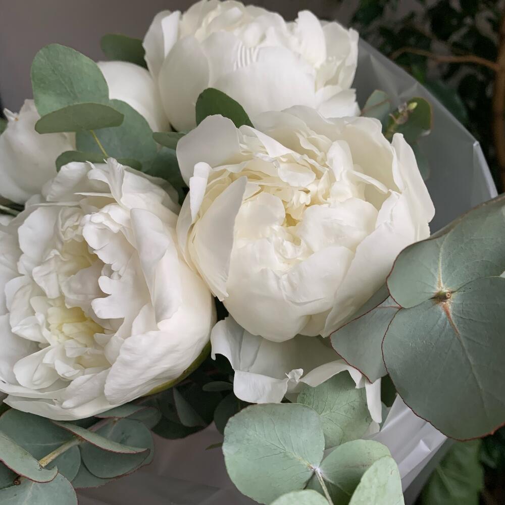 5 белоснежных пионов с эвкалиптом