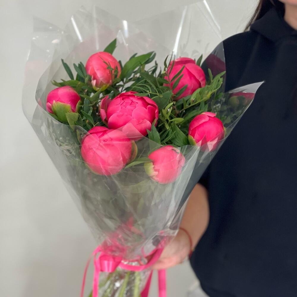 Пион Коралл Шарм (Coral Charm) – 7 шт.Лента атласная – 1 шт.Пленка прозрачная – 1 шт.фисташка зелень – 3 шт.