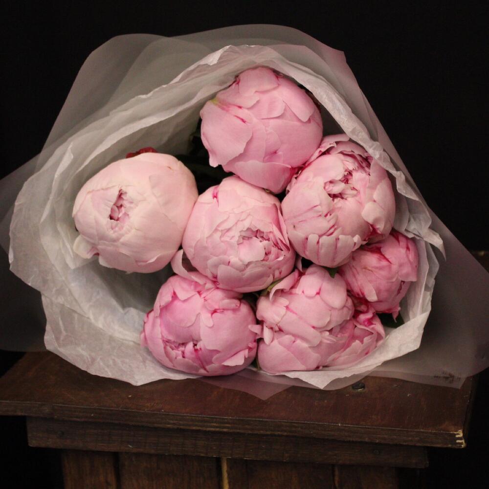 Лента атласная – 2 шт.Пион Сара Бернар – 7 шт.Пленка матовая – 3 шт.Тишью белое – 3 шт.