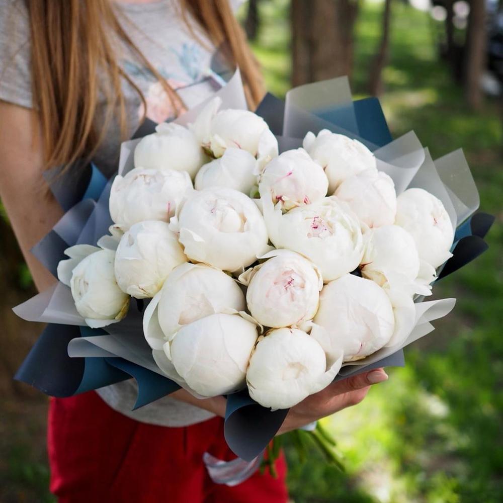 Букет из 19 белых пионов в дизайнерской упаковке "Эльза Сасс"