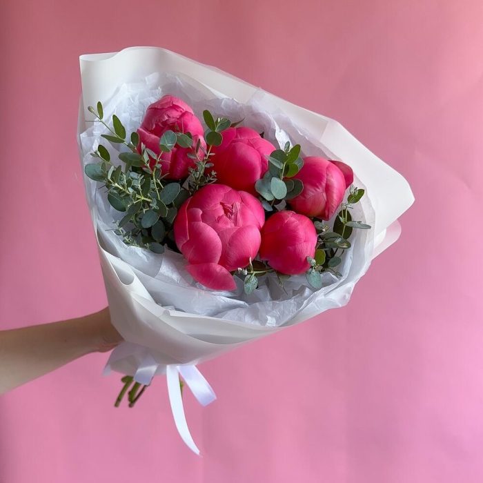 Коралл шарм пионы – 5 шт.Эвкалипт – 2 шт.Упаковка дизайнерская – 1 шт.