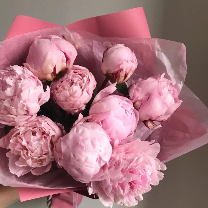 Лента – 2 шт.Пион Сара Бернар – 9 шт.Упаковка дизайнерская – 3 шт.Средство для продления жизни цветов – 2 шт.инструкция по уходу за цветами – 1 шт.