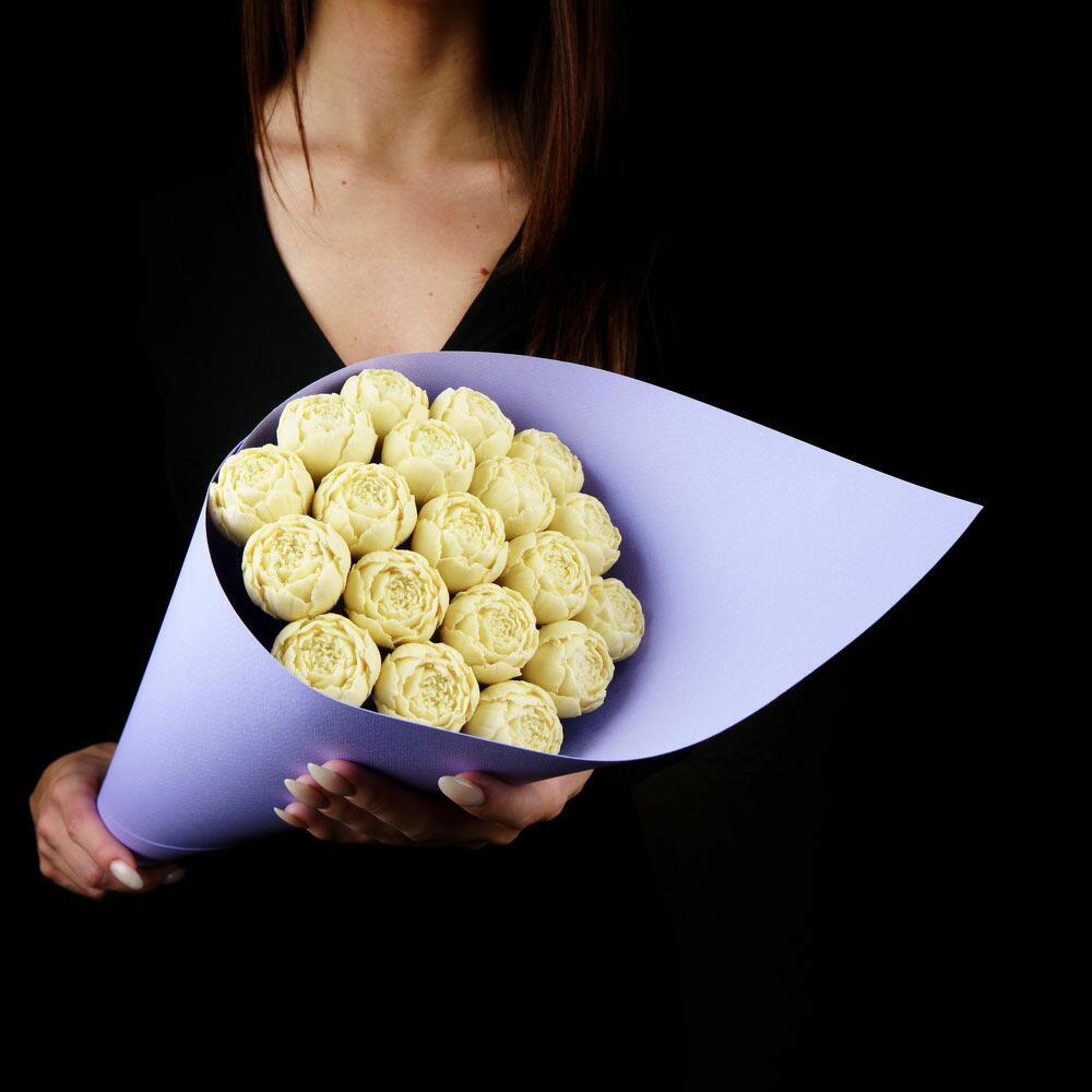 Упаковка Кулек – 1 шт.Прозрачная пленка – 1 шт.шоколадные пионы из бельгийского шоколада – 19 шт.