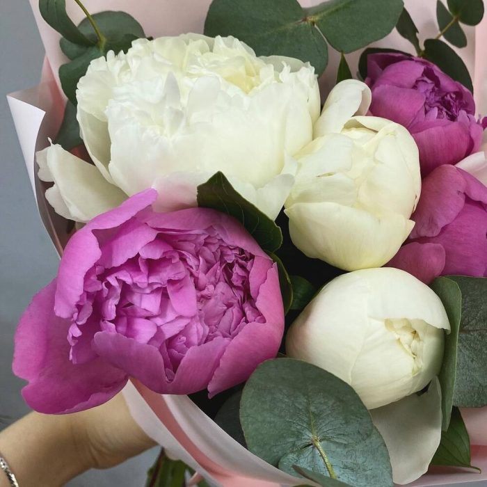 Пион – 7 шт.Эвкалипт – 3 шт.Лента атласная – 1 шт.Упаковка дизайнерская – 2 шт.