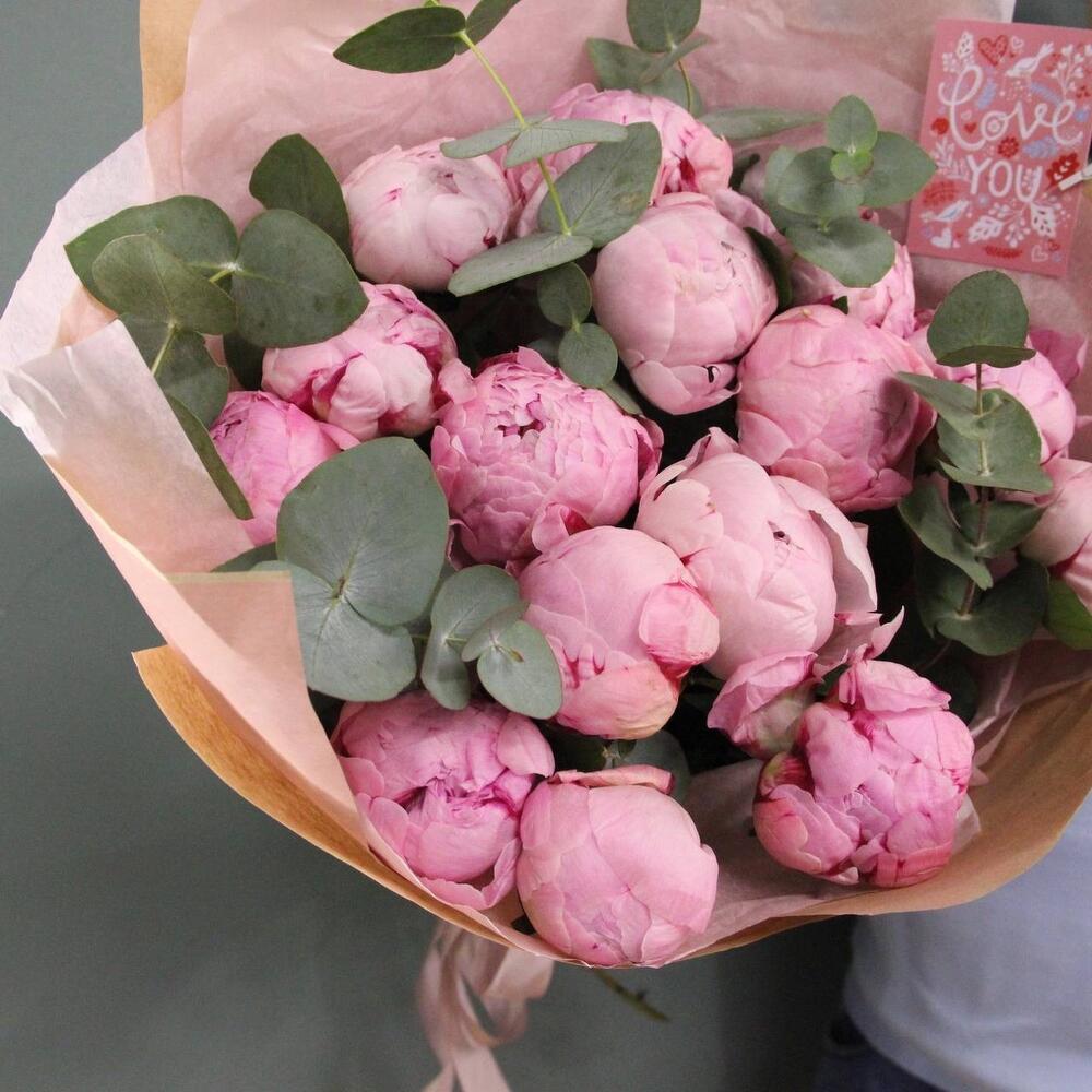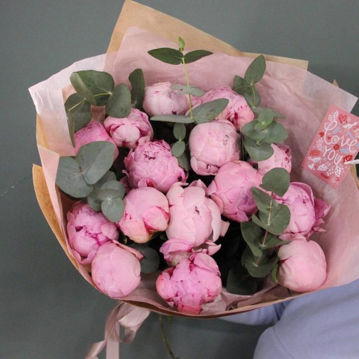 Пион – 15 шт.Эвкалипт – 5 шт.Упаковка – 1 шт.