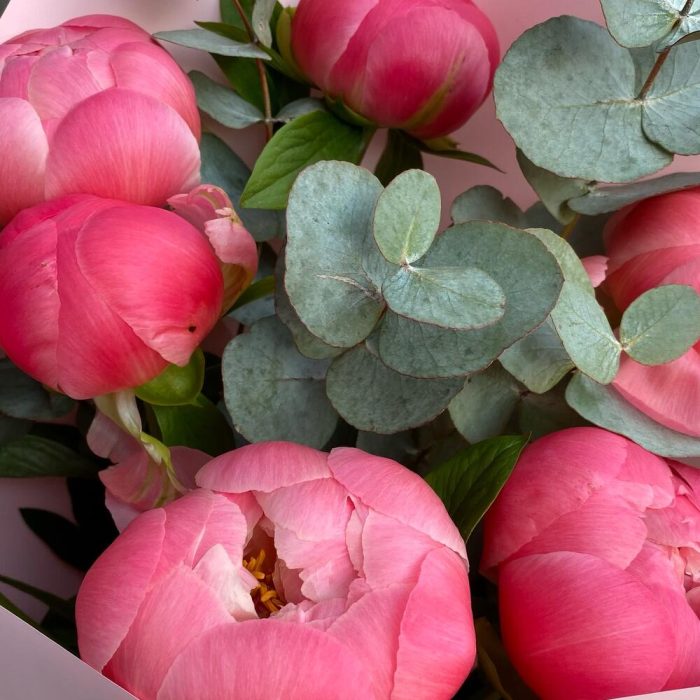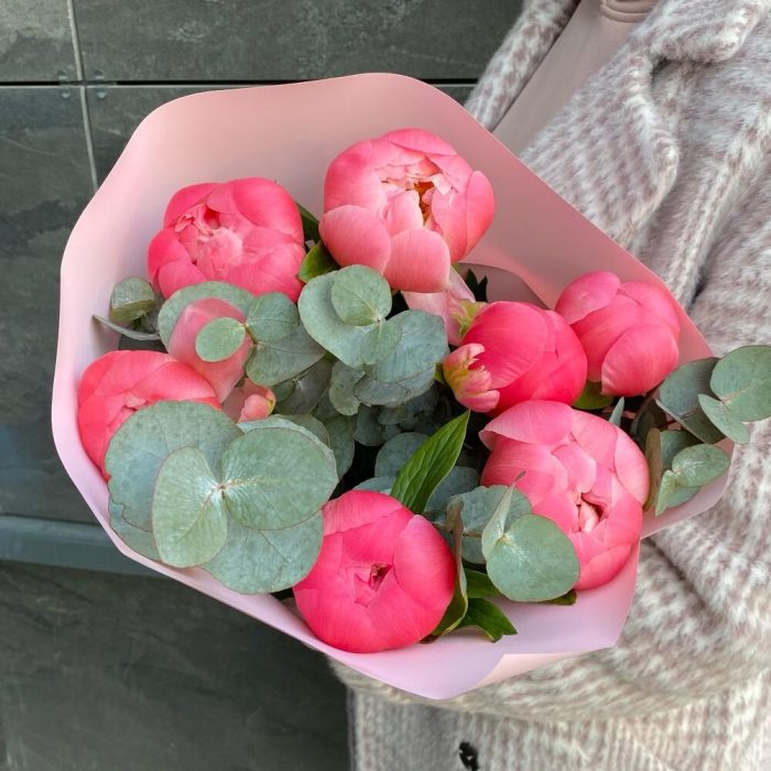 Пион Коралл Шарм (Coral Charm) – 7 шт.Лента атласная – 1 шт.Эвкалипт Синерия – 1 шт.Дизайнерская упаковка – 1 шт.