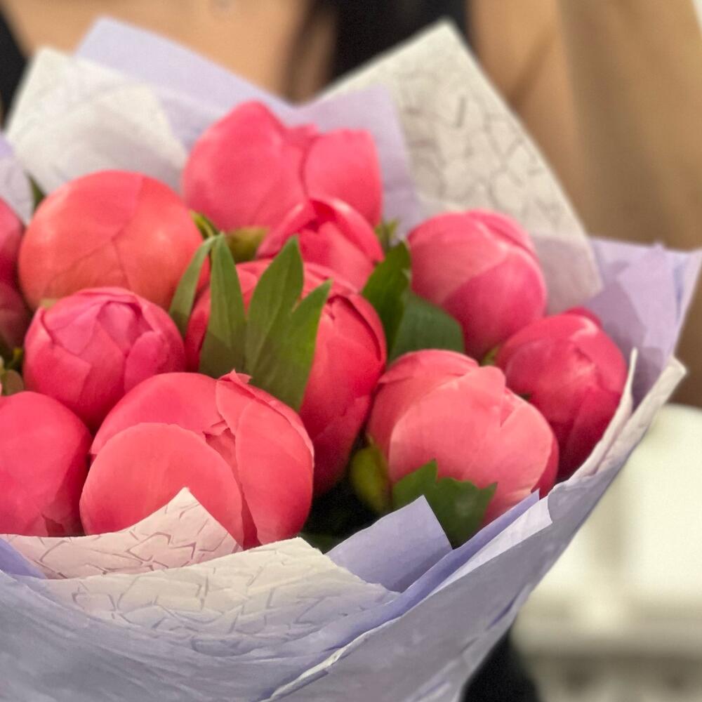 Букет с коралловыми пионами в оформленииСостав:11 пионовУпаковка (крафт + организа)Лента атласнаяБукет с коралловыми пионами сорта Коралл Сансет ( coral sunset), с зеленью фисташки с оформлением в крафтовую упаковку сиреневого цвета.Коралл Сансет необычный пион яркого цвета 100% удивит любого получателя. Бутоны раскрываются практически на глазах и это очень эффектное зрелище. Бутон распускается очень быстро, но это не значит, что он быстро начнёт увядать и осыпаться. Наоборот, в таком состоянии он будет стоять долго, а потом ещё, если повезёт начнёт менять цвет и бутон и яркого сочного превратится в нежный кремовый или молочный цвет.Есть ещё название этому пиону, пион-хамелеон. Пион меняющий свой цвет.