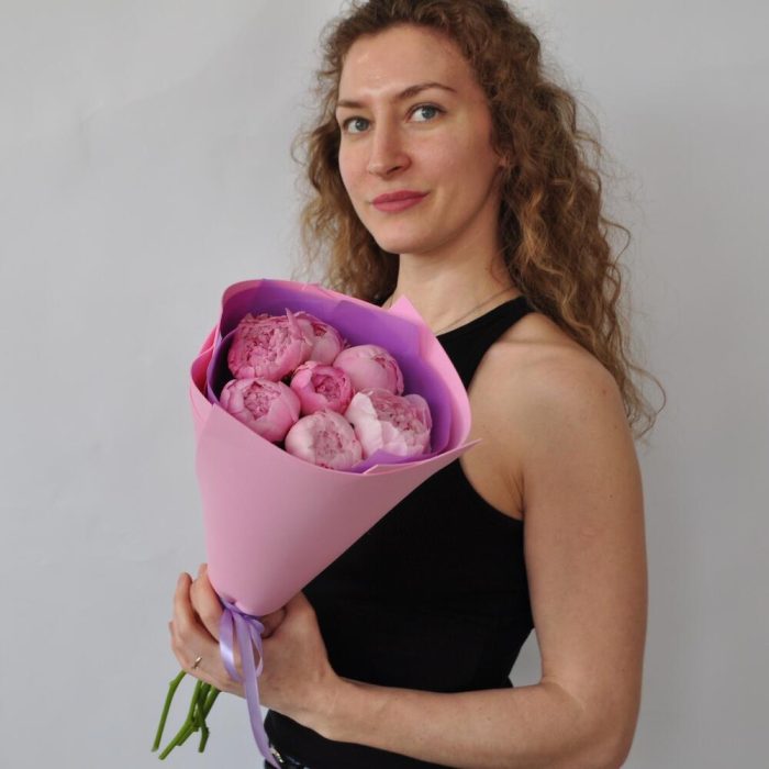 Пион Сара Бернар – 7 шт.Упаковка дизайнерская – 1 шт.Лента атласная – 1 шт.