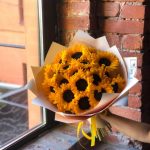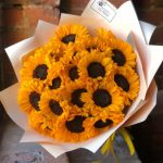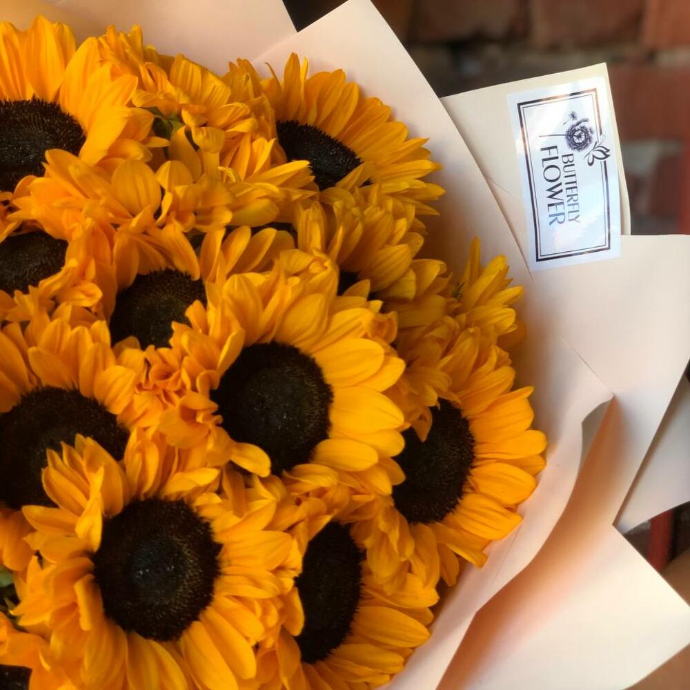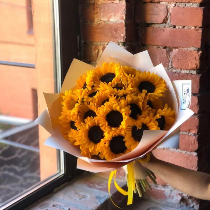 Букет из 19 подсолнухов в стильной упаковке “Абрасакс”