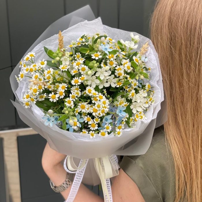 Букет из полевой ромашки и цветков оксипеталума с добавлением колосков в оформлении!