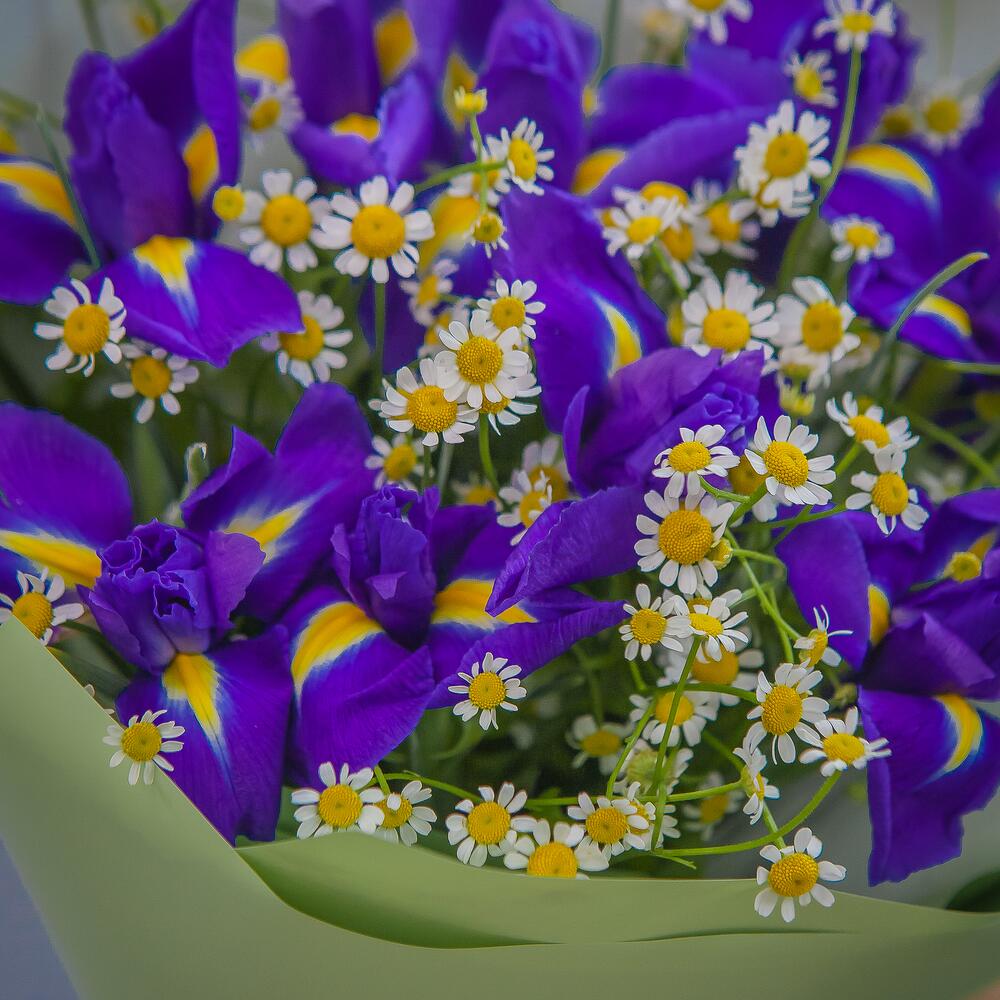 ирисы синие – 9 шт.Кустовая ромашка – 6 шт.Упаковка матовая – 1 шт.Атласная лента – 1 шт.