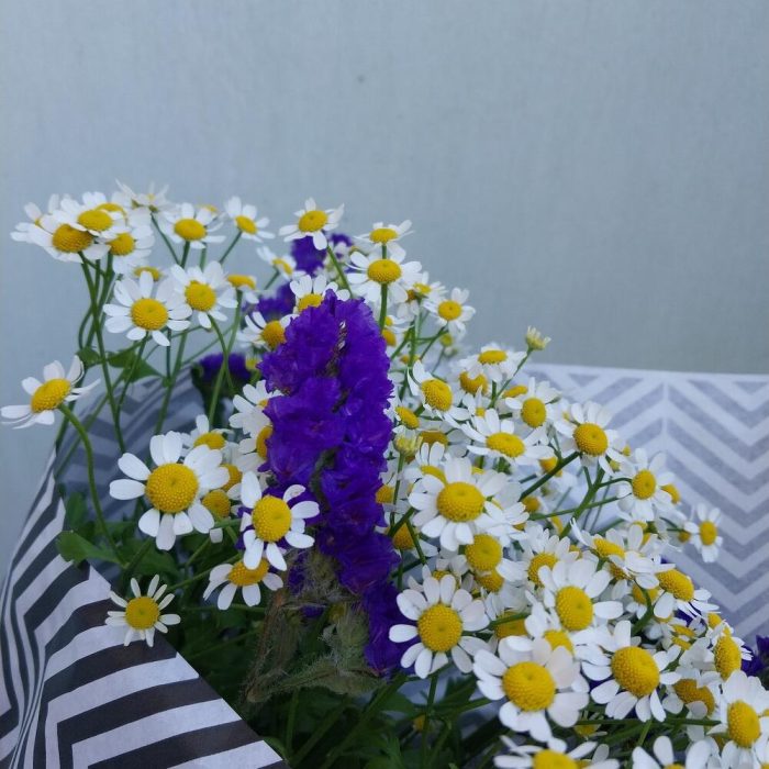 Статица – 1 шт.Лента атласная – 1 шт.Крафт упаковка – 1 шт.Матрикария (Ромашка Камила) – 5 шт.