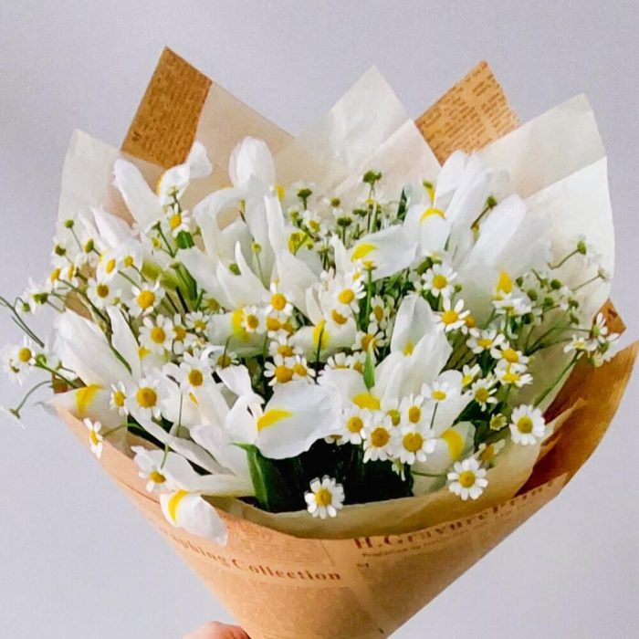 Лента атласная – 1 шт.Тишью – 2 шт.Ирис белый – 9 шт.Открыточка с вашими пожеланиями – 1 шт.бумага крафт – 1 шт.транспортировочная упаковка – 1 шт.ромашка (танацетум) – 8 шт.