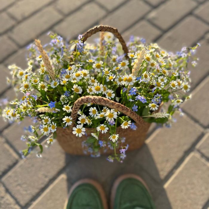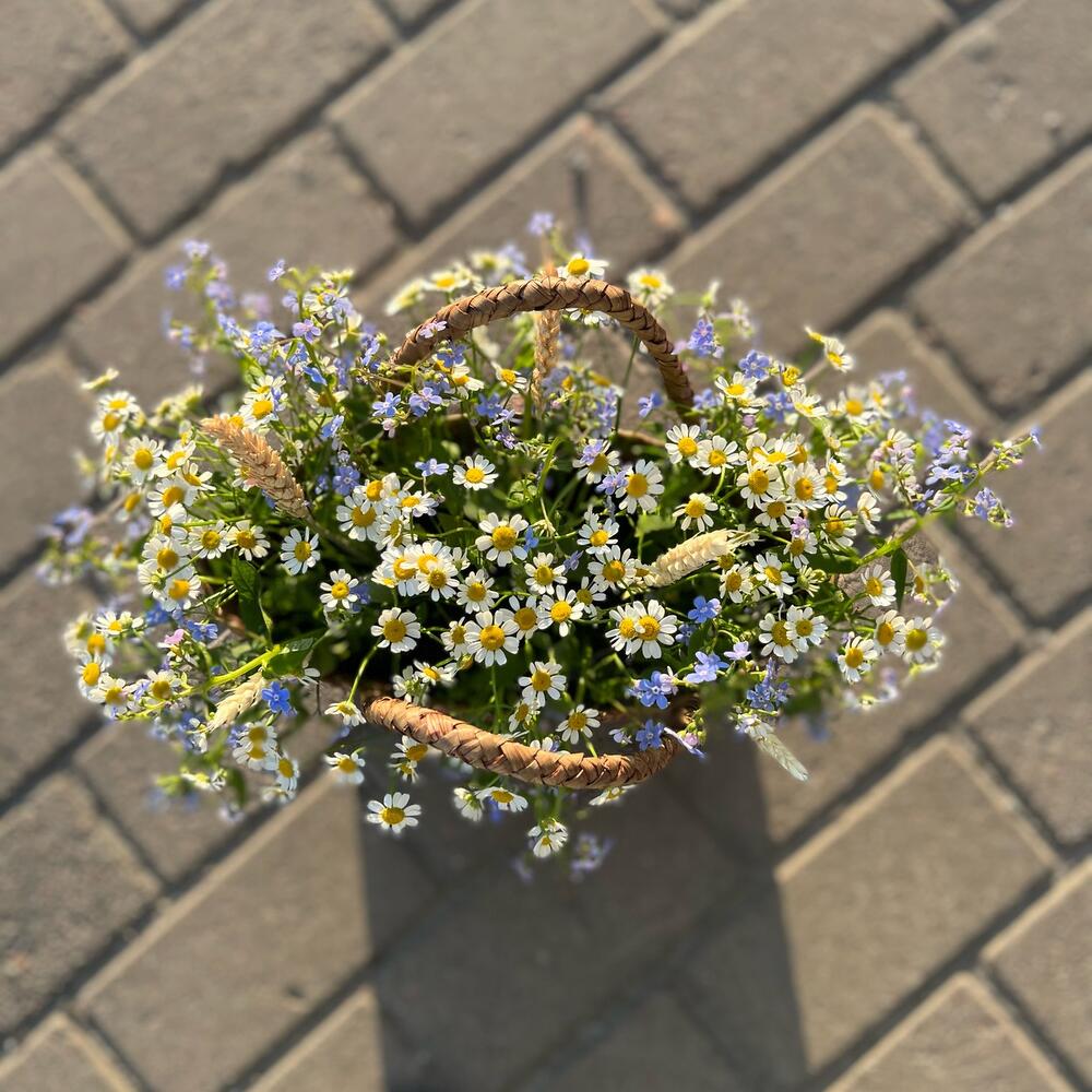 Ромашка кустовая – 5 шт.Колосья – 5 шт.Незабудка – 15 шт.Оазис флористический – 1 шт.Сумка плетеная ( ручная работа) – 1 шт.