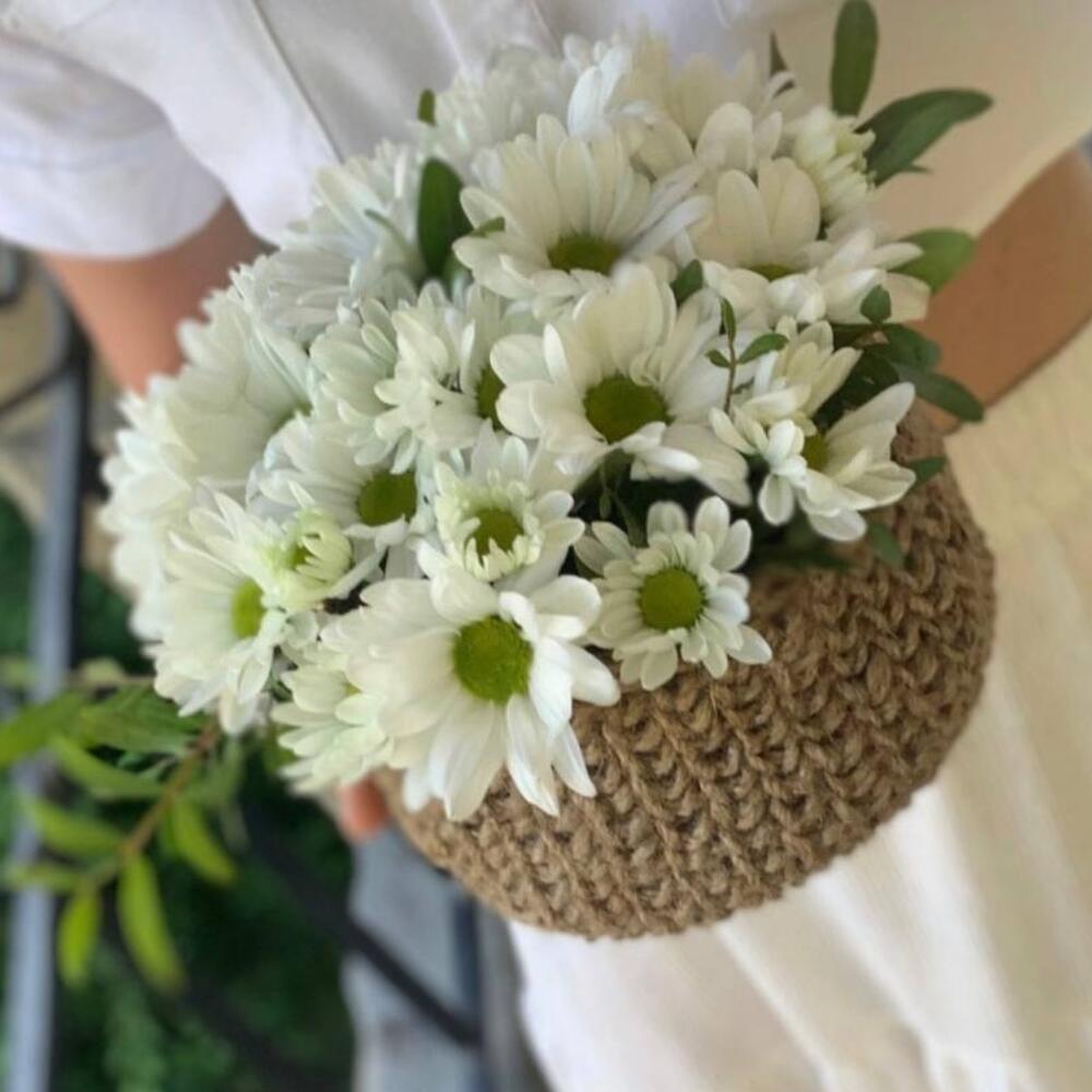 ромашки – 15 шт.вязанная корзина ручной работы – 1 шт.Флористическая губка – 1 шт.Лента атласная – 2 шт.