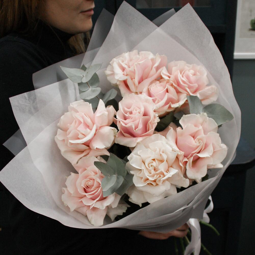 Эвкалипт – 2 шт.Тишью – 2 шт.Атласная лента – 2 шт.Французская роза – 9 шт.Матовая пленка – 2 шт.