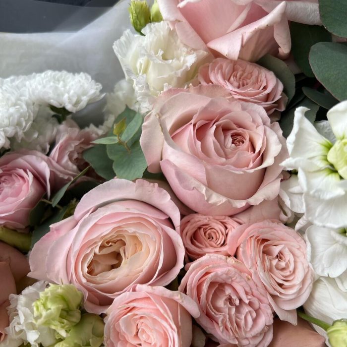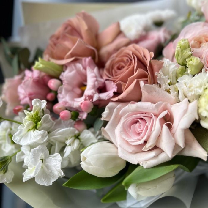 Гиперикум – 1 шт.Лизиантус – 1 шт.Маттиола – 2 шт.Тюльпан – 2 шт.Эвкалипт – 1 шт.Кустовая роза – 2 шт.Сантини – 1 шт.Пионовидная роза – 2 шт.Атласная лента – 1 шт.Одноголовая роза – 5 шт.декоративная упаковка – 1 шт.