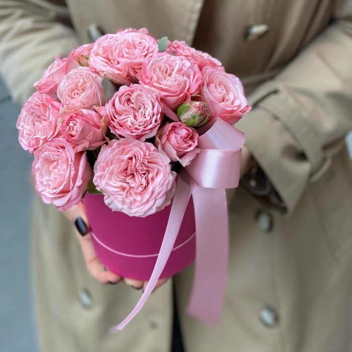 Роза кустовая Бомбастик – 3 шт.Эвкалипт – 2 шт.Шляпная коробка с лентами – 1 шт.