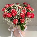 Гипсофила – 1 шт.Роза кустовая – 5 шт.Лента атласная – 3 шт.Тишью – 1 шт.Коробка шляпная – 1 шт.Оазис флористический – 1 шт.