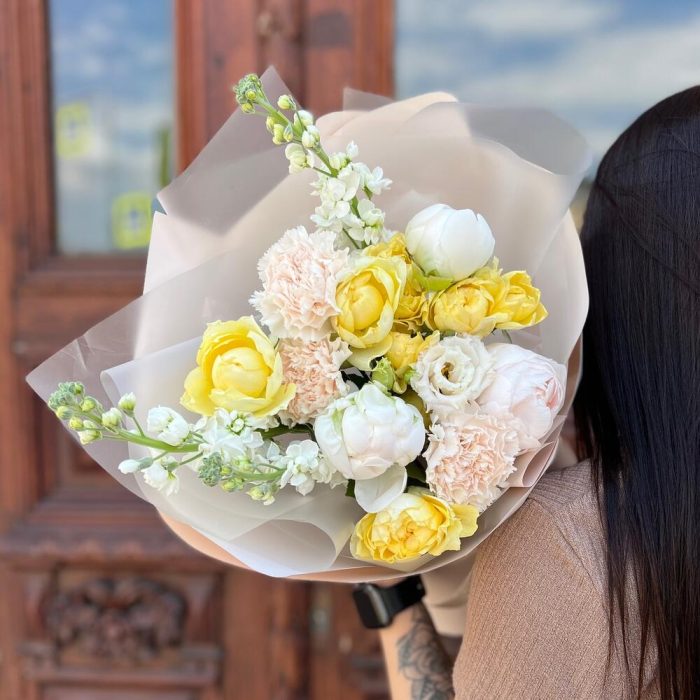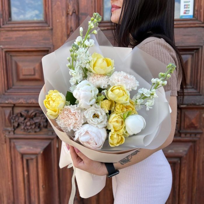 Маттиола – 3 шт.Лента атласная – 2 шт.Диантус – 3 шт.Пион белый – 3 шт.Пленка матовая – 7 шт.эустома махровая белая – 1 шт.роза кустовая пионовидная желтая – 2 шт.