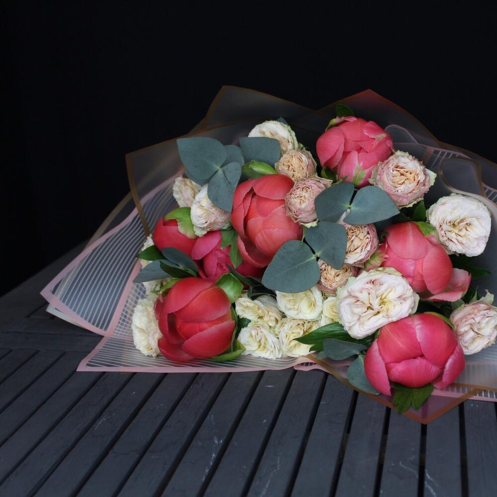 пионы Коралл шарм – 7 шт.роза пионовидная кустовая трендсеттер – 4 шт.Эвкалипт – 3 шт.Пленка матовая – 3 шт.Лента атласная – 2 шт.