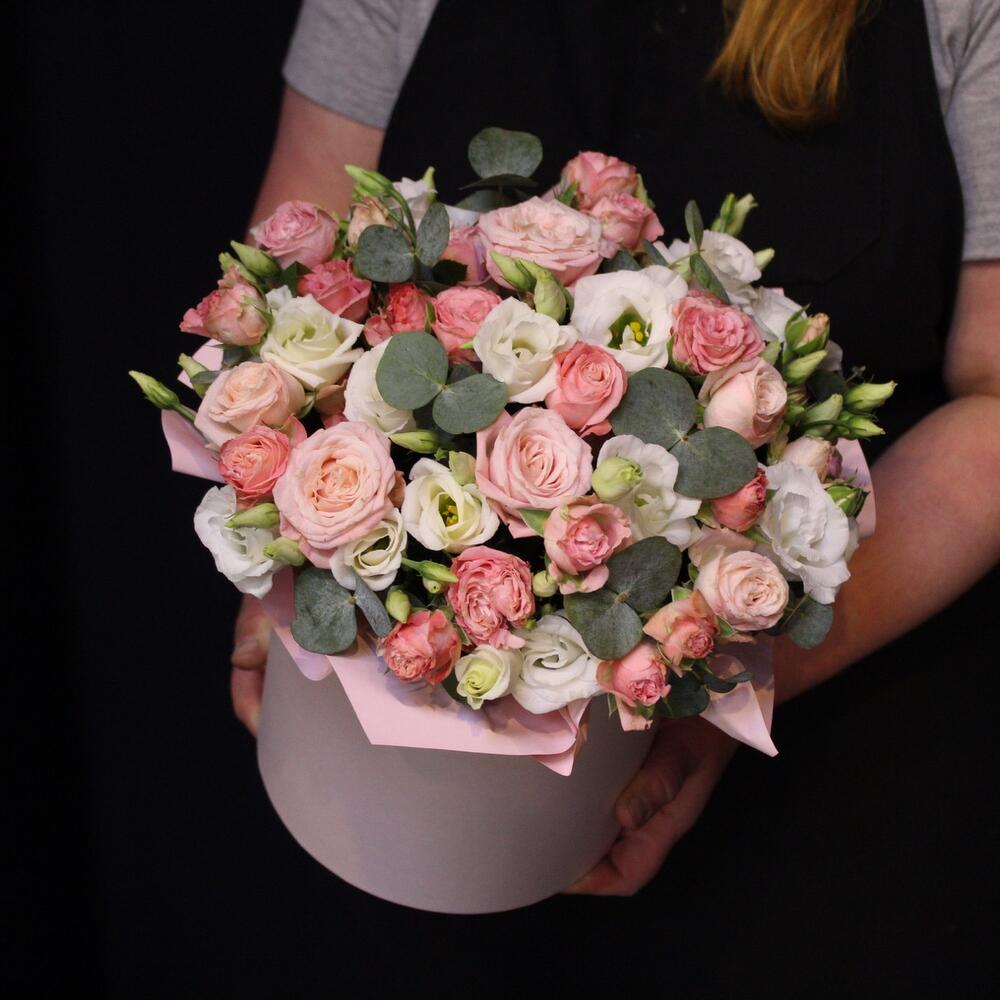 Эвкалипт – 2 шт.Шляпная коробка – 1 шт.Оазис флористический – 1 шт.эустома белая – 3 шт.Роза кустовая пионовидная мадам бомбастик – 6 шт.Пленка дизайнерская – 1 шт.