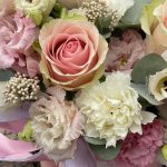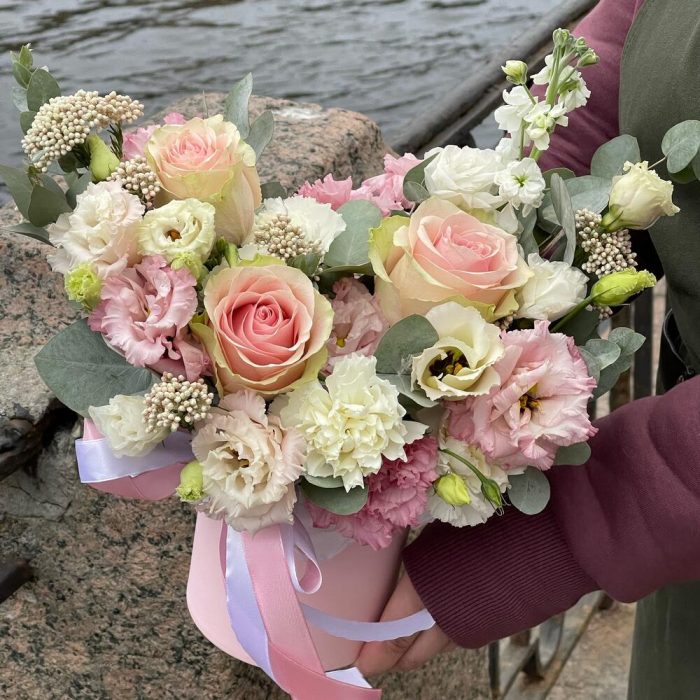 Маттиола – 1 шт.Озотамнус – 2 шт.Эвкалипт – 2 шт.Лента атласная – 2 шт.Диантус – 3 шт.Коробка шляпная – 1 шт.Оазис флористический – 1 шт.эустома розовая махровая – 2 шт.эустома белая – 1 шт.роза эквадор фруттето – 3 шт.